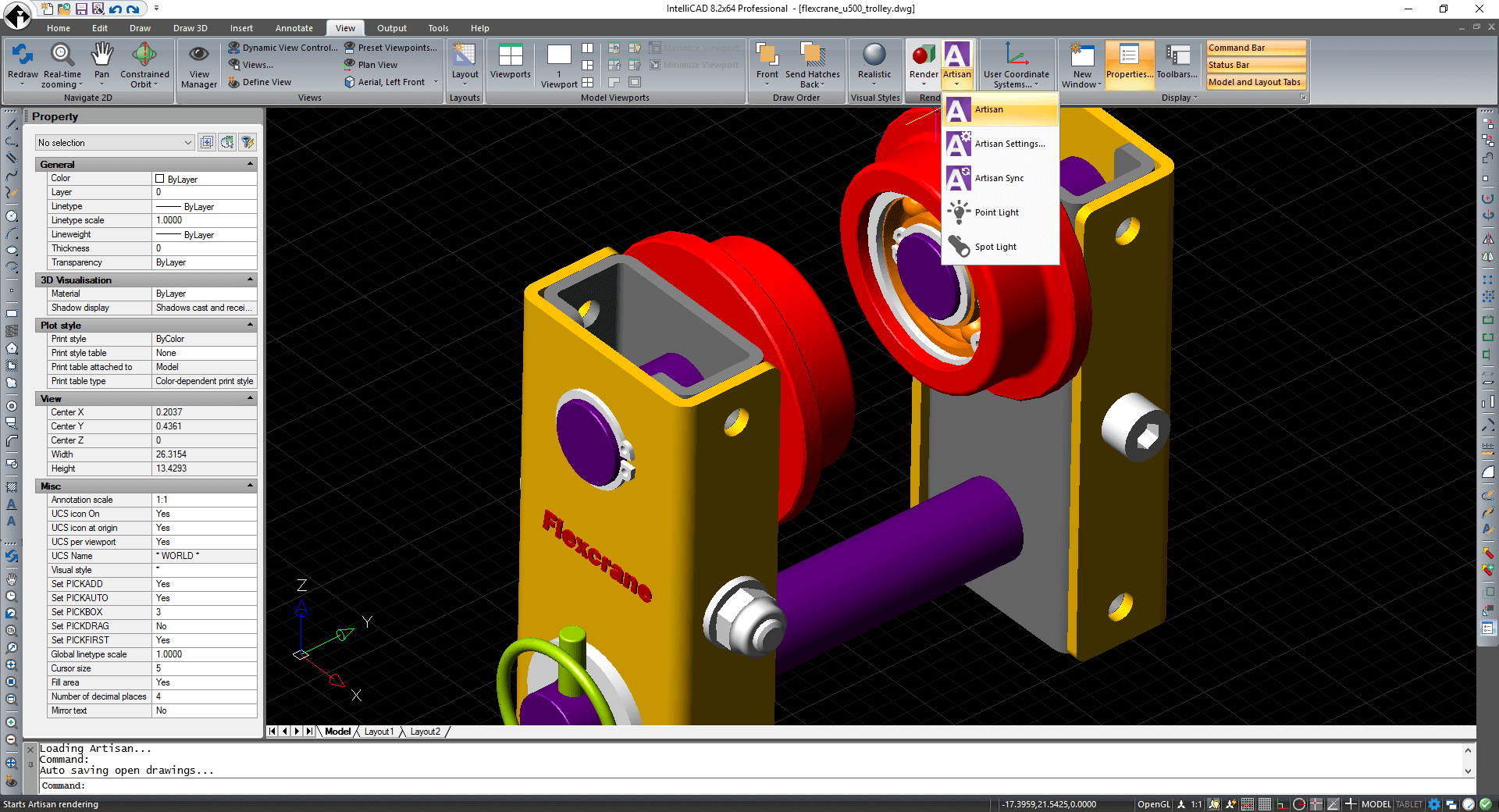 Teraz poskytujúc ešte pokročilejšie nástroje na vykresľovanie, CMS IntelliCAD obsahuje ďalšie rozhranie renderingu - ARTISAN, ktorý vytvorí z vašich výkresov vysoko kvalitné fotorealistické obrázky a to rýchlo a jednoducho. Pár kliknutiami môžete vybrať zo širokej škály prednastavených materiálov a nastavení osvetlenia a vykresliť si výkres. Ďalšie prispôsobenie je jednoduché, vrátane tvorby vlastných realistických materiálov..